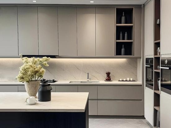 هذا الموفر للمساحة خزائن المطبخ على شكل حرف L بلمسة نهائية رمادية عصرية، صُممت هذه الوحدة لتجمع بين الكفاءة والأناقة. توفر مساحة تخزين واسعة إلى جانب أرفف مفتوحة عملية لسهولة الوصول إلى مستلزمات الطبخ اليومية. جزيرة الكوارتز البيضاء المرفقة لا تُضفي لمسةً أنيقة فحسب، بل تُمثل أيضًا ركنًا عمليًا لتناول الطعام السريع للعائلة، مما يجعلها القلب النابض بالحياة في منزلٍ مفعم بالنشاط.