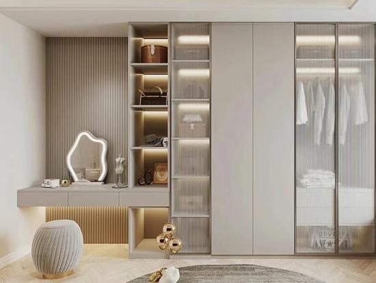 هذا خزانة ملابس خشبية حديثة تتميز بأبواب زجاجية عمودية وأبواب من الخشب المضغوط، بالإضافة إلى حجرات مفتوحة. كما تأتي مع طاولة زينة. خزانة ملابس متعددة الوظائف مناسب للعديد من الصديقات.