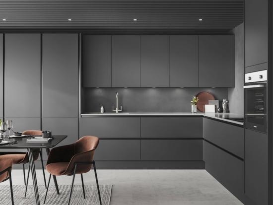 هذا الأسود النقي خزانة مطبخ حديثة ، بمظهره المسطح، يتوافق مع المعايير الجمالية للشباب المعاصر.